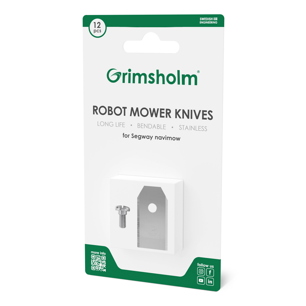Sørg for at din Segway Navimow robotplæneklipper altid leverer et skarpt og jævnt klipperesultat med dette sæt af Grimsholm knive og skruer. Knivene er fremstillet i rustfrit stål og designet til at opnå den perfekte balance mellem styrke, skarphed og slidstyrke – ideelt til at holde plænen flot hele sæsonen.